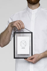 Der kleine Wechselrahmen von MOEBE aus Dänemark im Format A5 (148 x 210 mm) ist wahlweise in schwarz pulverbeschichtetem Aluminium oder in Eiche natur erhältlich. Der vierteilige Rahmen fasst zwei klare Plexiglasscheiben, alles wird von einem umlaufenden Gummiband zusammengehalten, das auch zum Aufhängen des Rahmens dient. Die Rahmen können problemlos gestellt oder gehängt werden, weil sie sehr leicht sind. Sieht auch vor dem Fenster toll aus.
