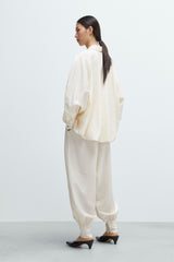 Dieses Oversize-Hemd von CORDERA ist aus einem fliessenden, leicht transparenten Stoff gefertigt, der wunderschön am Körper fällt. Es hat einen ballonartigen Rücken mit einem längeren Saum hinten für mehr Bewegungsfreiheit und Volumen. Es ist mit einem klassischen spitzen Kragen, einer Knopfleiste vorne und voluminösen Ärmeln gestaltet, die in weiten Manschetten mit zwei kleinen Knöpfen zusammenlaufen.