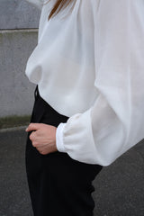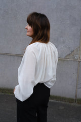 Lockere Bluse mit Stehkragen und Knopfverschluss-Leiste in vorderer Mitte. Um den Hals und an der Manschette ist die Bluse angezögelt.
