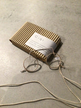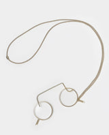 Sorgfältig gemachte, futuristische Retro-Lesebrille der japanischen Brillen-Marke CIQI. Feiner, messingfarbener Metallrahmen mit mit einer leichten grauen Schnur, mit der die Brille um den Hals getragen werden kann.