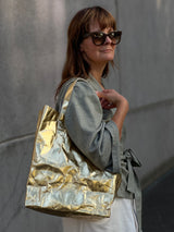 Wir relaunchen unseren klassischen Metallic Shopper. Dieselbe Form und Grösse, jedoch neu in Papierleder - knautschig, modern und shiny!