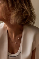Einfach und elegant: Ovale baumelnde Perlen wie Tropfen an der Halskette. Eine sehr elegante Kombination von Charlotte Wooning aus Rotterdam. Die frischen weissen Perlen bringen einen Look total zum Strahlen.