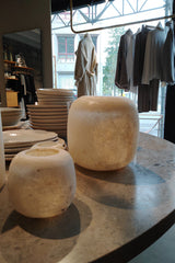 im Ovale Lichtgefässe, naturbelassener Alabaster, handbearbeitet - in drei Grössen - von Sirocco Living aus Dänemark.