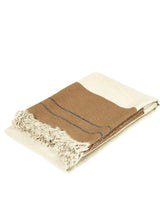 Edles Plaid (Tagesdecke) der Serie «Gus» im Format 140 x 220 cm, gewoben und konfektioniert von LIBECO in Belgien. Naturfarbener Fond mit Braun und Schwarz. 70% Leinen, 30% Wolle, Gewicht 610g/m2.
