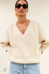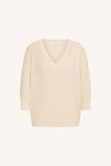 Der cremefarbene Lune Five Pullover von BY-BAR aus den Niederlanden ist ein lässiger Pullover mit bequemer Normalpassform und stilvollem V-Ausschnitt. Perfekt für den Alltag, wenn Sie mühelos Stil und Komfort kombinieren möchten. Dieser Pullover mit 3/4-Ärmeln ist eine vielseitige Ergänzung Ihrer Garderobe.