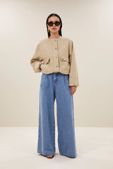 Die Maggie Canvas Jacket von BY-BAR aus den Niederlanden ist eine lässige Jacke mit lockerer Passform und einem coolen Stehkragen. Die verdeckten Seitentaschen und der Druckknopfverschluss sorgen für ein klares und modernes Design. Die Jacke ist aus einer bequemen Leinen-Baumwoll-Mischung gefertigt und hat lange Ärmel, wodurch sie sich perfekt für den Alltag eignet.