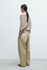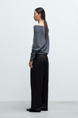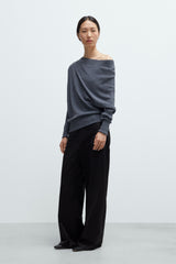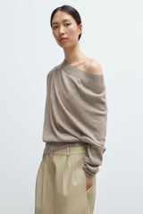 Dieser schulterfreie Pullover von CORDERA ist aus weicher Merinowolle gefertigt und hat eine reguläre, sanft drapierte Silhouette. Er verfügt über lange Ärmel, die vom Handgelenk bis zum Ellbogen eng anliegen und eine elegante, feminine Linie bilden. Gerippte Bündchen an Ärmeln, Saum und Ausschnitt sorgen für eine dezente Struktur und Textur.