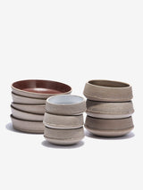 Jedes Stück dieser Kollektion wird von Hand mit einer Ziehklinge bearbeitet, um eine raue Textur zu erzeugen, die ihm ein kühneres Aussehen verleiht. Selbst die dabei entstehenden Reste werden als dekoratives Element aufbewahrt, das der Kollektion und ihren Kurven mehr Charakter verleiht. Um die rohe Schönheit des Tons zu bewahren, wird nur die Innenseite mit einer halbreaktiven Glasur versehen, die einen einzigartigen, aber weichen Griff verleiht. Alles in allem schaffen sie das perfekte Gleichgewicht zwischen Dekoration und Funktionalität.