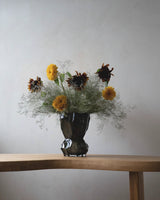 Mit einer Form, die von antiken französischen Blumenvasen inspiriert ist, und einer Struktur, die von einer großartigen Bergreflexion inspiriert ist, verbindet sie zwei einzigartige Kräfte. Eine Mischung aus floristischer Funktionalität und der Ruhe der Natur schafft dieses einzigartige Mittelstück.