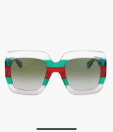 Gucci GG0178S – chunky, oversized, unisex style with a clear acetate frame, features a green and red stripe detail on the frame or temples. Green lenses that offer 100% UVA/B protection.