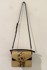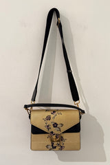Coccinelle Ambrine leather handbag with golden metallic-effect and foral print. Comes with two different straps.