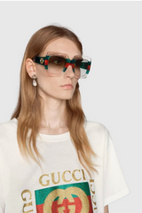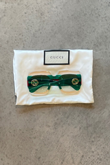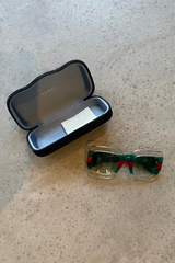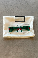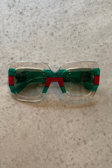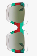 Gucci GG0178S – chunky, oversized, unisex style with a clear acetate frame, features a green and red stripe detail on the frame or temples. Green lenses that offer 100% UVA/B protection.