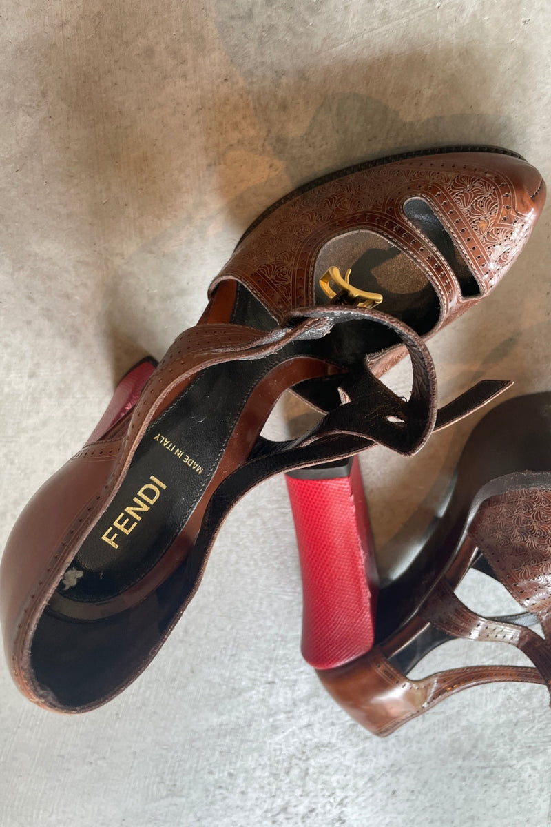 Stunning Fendi Pumps in brown leather with beautiful pattern details. The cuban heel is in red lizard leather. In good condition, with some damages on the inner side of the heel. Nevertheless it's a very special piece!